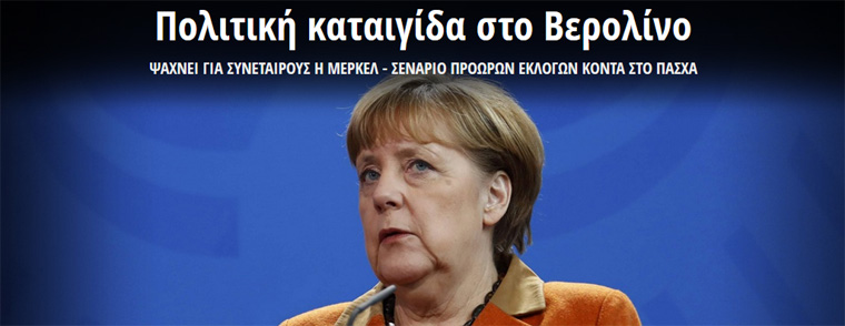 Με τον ενδεικτικό τίτλο «Λύση ή διάλυση;» η γαλλική «Liberation» εξηγεί το τι ακριβώς συμβαίνει στο Βερολίνο τα τελευταία 24ωρα. Αν και αποδυναμωμένη, η Γερμανίδα καγκελάριος δεν τα παρατάει εύκολα, ωστόσο στη γερμανική πρωτεύουσα οι πάντες διαισθάνονται πως ολοκληρώνεται ένας κύκλος αλλά και μια αναμφισβήτητη κυριαρχία.
