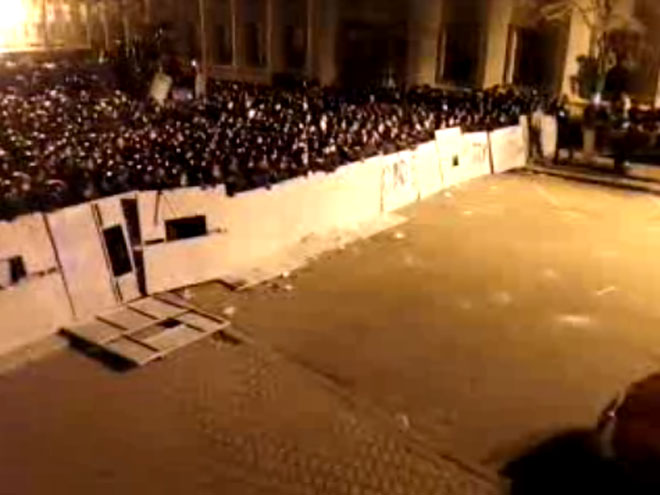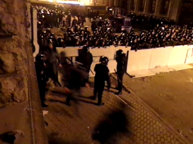 Λίγο νωρίτερα αυτόπτες μάρτυρες, που επικαλείτο το Ρόιτερς, είχαν δηλώσει ότι μια ομάδα διαδηλωτών, που μετείχε στην τεράστια πορεία διαμαρτυρίας στην ουκρανική πρωτεύουσα, χρησιμοποίησε ένα τρακτέρ σε μια προσπάθεια να σπάσει τον κλοιό της αστυνομίας κοντά στα γραφεία του προέδρου Βίκτορ Γιανουκόβιτς.