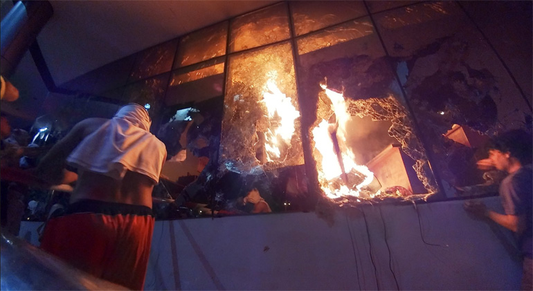 Διαδηλωτές συγκρούστηκαν με την αστυνομία, έβαλαν φωτιά σε λάστιχα, διαπέρασαν μέρος των φρακτών γύρω από το κτίριο, έσπασαν πόρτες και παράθυρα, ενώ αστυνομικοί με εξαρτύσεις αντιμετώπισης ταραχών αντέδρασαν κάνοντας εκτεταμένη χρήση δακρυγόνων και σφαιρών από καουτσούκ, σύμφωνα με πλάνα που μετέδωσαν τηλεοπτικοί σταθμοί.