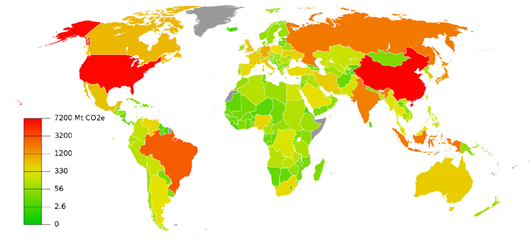 Στον παγκόσμιο χάρτη είναι «σημαδεμένες» οι πιο ρυπογόνες χώρες στον κόσμο: οι Ηνωμένες Πολιτείες, η Κίνα, η Ρωσία, η Βραζιλία και η Ινδία.
