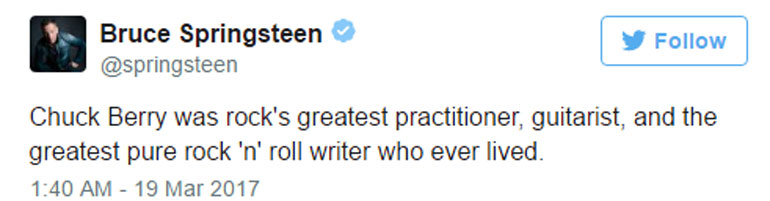 – Μπρους Σπρίνγκστιν: «Ο Τσακ Μπέρι ήταν ο πιο μεγάλος από τους ρόκερ, τους κιθαρίστες και ο πιο μεγάλος από τους στιχουργούς του ροκ που έζησε ποτέ. Είναι μια τεράστια απώλεια, η απώλεια ενός γίγαντα για πάντα».