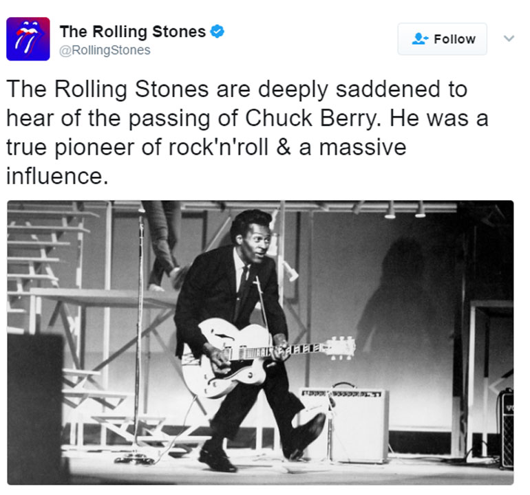 – The Rolling Stones: «Με μεγάλη θλίψη οι Rolling Stones έμαθαν τον θάνατο του Τσακ Μπέρι. Ήταν ένας αληθινός πρωτοπόρος του ροκ, μια απίστευτη επιρροή. Ο Τσακ Μπέρι δεν ήταν μόνο ένας λαμπρός κιθαρίστας, ένας λαμπρός τραγουδιστής, ήταν επίσης λαμπρός στη σκηνή και κυρίως ήταν ένας αληθινός μετρ ως στιχουργός. Τα τραγούδια του Τσακ Μπέρι θα είναι αιώνια».