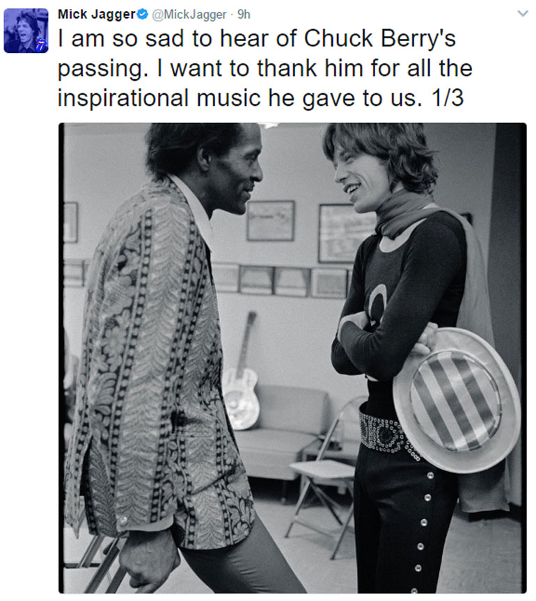 – Μικ Τζάγκερ: «Είμαι τόσο θλιμμένος που έμαθα την είδηση του θανάτου του Τσακ Μπέρι. Θέλω να τον ευχαριστήσω για όλη αυτή τη μουσική που μας έδωσε και που τόσο μας ενέπνευσε. Φώτισε τα χρόνια της εφηβείας μας, έδωσε ζωή στα όνειρά μας να γίνουμε μουσικοί και να ανέβουμε στη σκηνή. Οι στίχοι του έλαμψαν πάνω απ’ όλα και φώτιζαν μ’ ένα παράξενο φως αυτό το περίφημο αμερικανικό όνειρο. Τσακ, ήσουν απίστευτος και η μουσική σου θα μείνει χαραγμένη μέσα μας για πάντα».