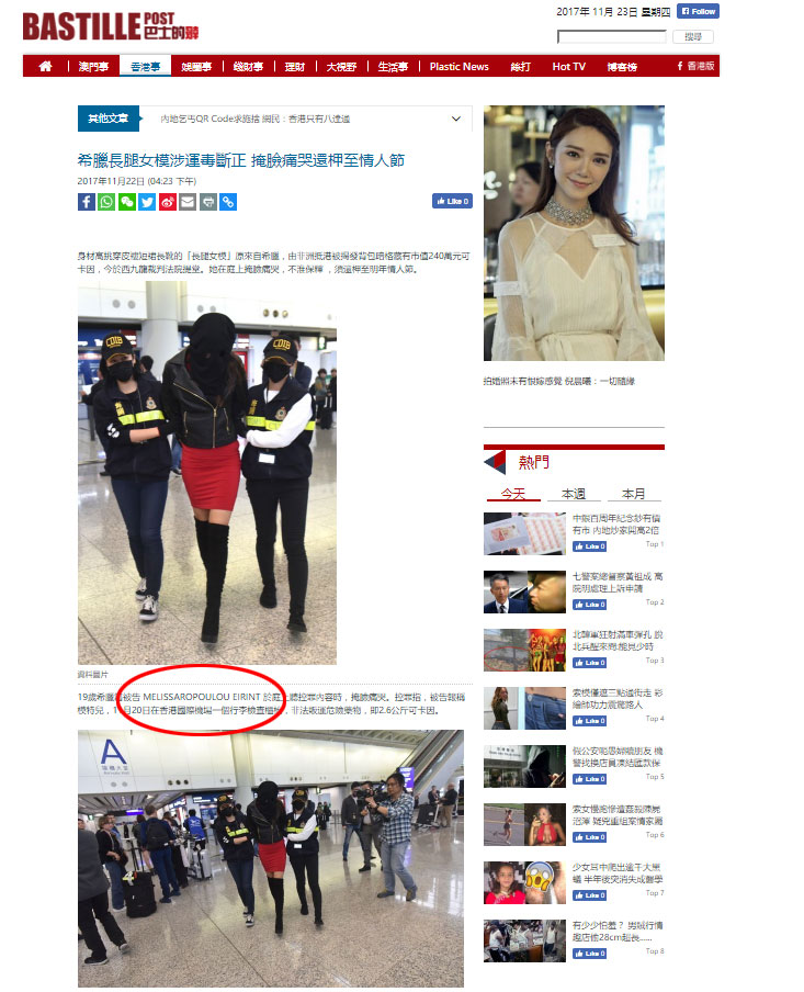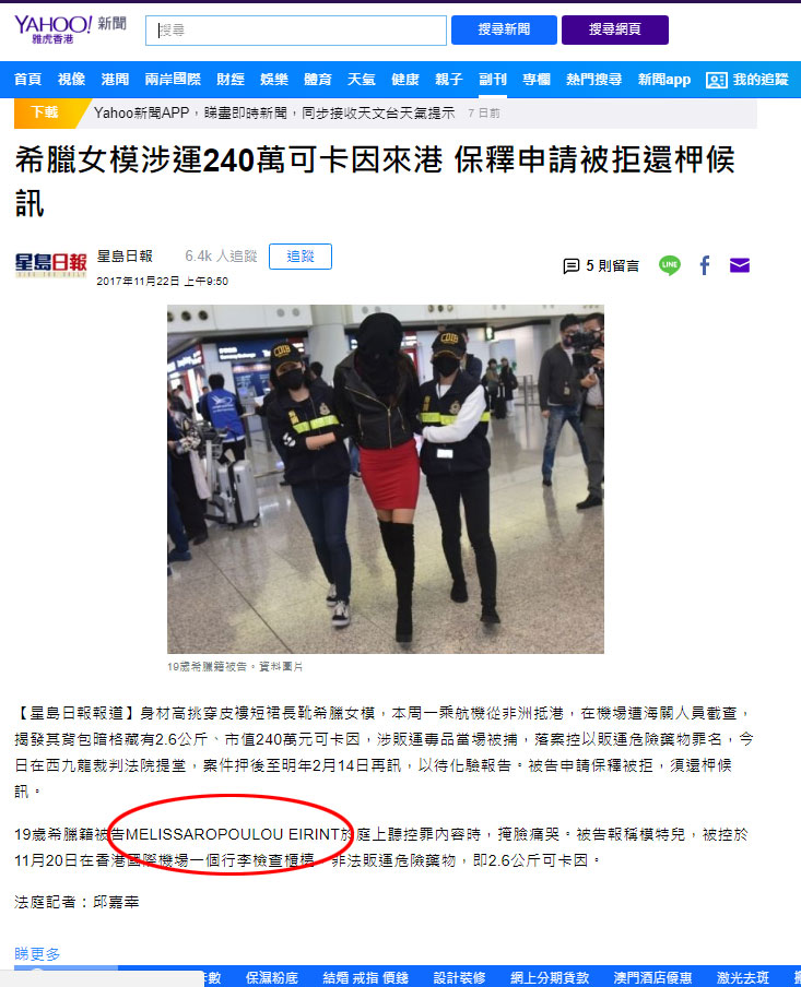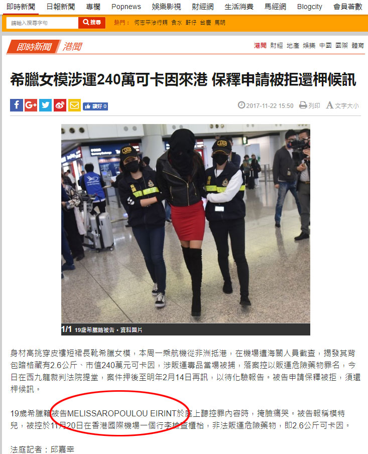 Μια Ελληνίδα μόλις 19 ετών, η οποία από την Ευρώπη ταξίδεψε στην Αιθιοπία και από εκεί στο Χονγκ Κονγκ, συνελήφθη στο αεροδρόμιο της πόλης αφού οι τελωνειακές αρχές ανακάλυψαν στις αποσκευές της 2,6 κιλά κοκαΐνης. Όπως αναφέρουν τα Μέσα Ενημέρωσης του Χονγκ Κονγκ, πρόκειται για την Μελισσαροπούλου Ειριντ, σύμφωνα με την καταγραφή του ονόματός της στα τοπικά ρεπορτάζ.