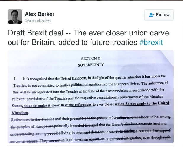 Δύο από τις πρόνοιες της συμφωνίας πρόκειται να εγγραφούν σε αναθεωρημένα άρθρα της Συνθήκης της ΕΕ: μια ειδική εξαίρεση της Βρετανίας από την περαιτέρω ολοκλήρωσή της, στο πλαίσιο μιας διαδικασίας που αποκαλείται “όλο και πιο στενή ολοκλήρωση”· και η δίκαιη αντιμετώπιση των χρηματοπιστωτικών και οικονομικών διευθετήσεων ανάμεσα στην ευρωζώνη και τα κράτη-μέλη της ΕΕ που δεν ανήκουν στην οικονομική και νομισματική ένωση.