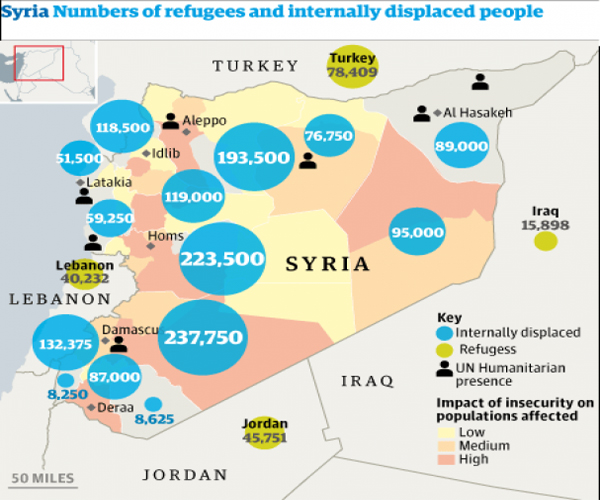 Σύμφωνα με το Associated Press, ο αριθμός των νεκρών από τα μέσα Μαρτίου του 2011, όταν και ξεκίνησαν οι μεγάλες διαδηλώσεις για την εκχώρηση συνταγματικών ελευθεριών στους πολίτες, έχει ξεπεράσει πλέον τους 40.000. Εκτιμάται ότι περίπου 250.000 πρόσφυγες έχουν περάσει τα σύνορα, με τον καταυλισμό Ζαατάρι να φιλοξενεί τουλάχιστον 45.000, εκ των οποίων τα 2/3 είναι γυναικόπαιδα.
