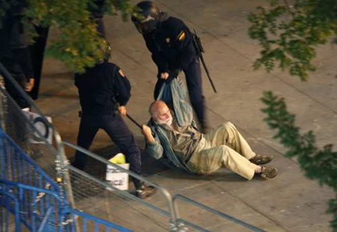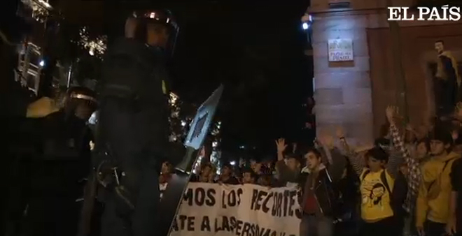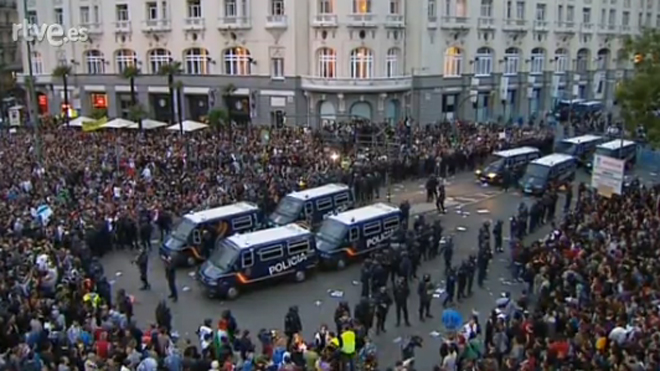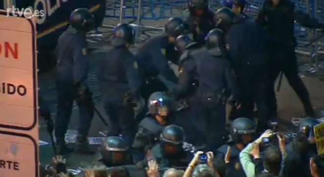 Από τη διαδήλωση στην ισπανική πρωτεύουσα δεν έλειψαν τα επεισόδια μεταξύ διαδηλωτών και αστυνομικών δυνάμεων, με τις δεύτερες να έχουν αποκλείσει ήδη από το πρωί την πρόσβαση στο Κοινοβούλιο, ακόμα και με σιδερένιους φράχτες. Κεντρικό σύνθημα των συμμετεχόντων στη διαμαρτυρία είναι: «Λαός ενωμένος, ποτέ νικημένος».