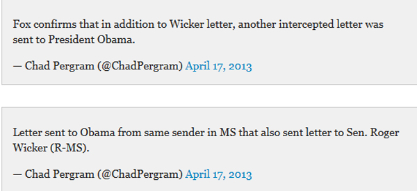 Τα γράμματα ήταν εμποτισμένα με το ίδιο δηλητήριο. Σύμφωνα με το Fox News, το γράμμα που προοριζόταν για τον Ομπάμα, είχε τον ίδιο αποστολέα με την «παγιδευμένη» επιστολή που είχε παραλήπτη τον Γουίκερ.