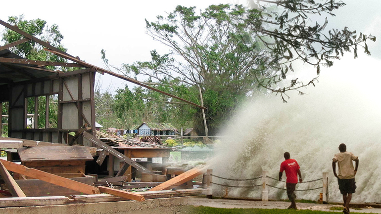 Ο κυκλώνας Παμ, κατηγορίας 5, συνοδευόμενους από ανέμους εντάσεως έως 340 χλμ./ώρα γύρω από το κέντρο του, έπληξε το εύθραυστο νησιωτικό σύμπλεγμα του αρχιπελάγους τα ξημερώματα του Σαββάτου και πέρασε πολύ κοντά από την πρωτεύουσα -και μεγαλύτερη πόλη του- το Πορτ Βίλα.