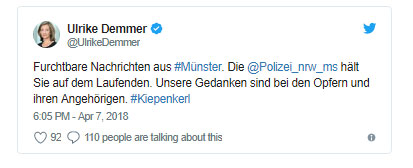 «Τρομακτικές ειδήσεις από το Μίνστερ. Η Αστυνομία της Βόρειας-Ρηνανίας Βεστφαλίας σας κρατά ενήμερους. Η σκέψη μας είναι στα θύματα και τους οικείους τους», έγραψε πριν από λίγο στον προσωπικό της λογαριασμό το Twitter η αναπληρώτρια κυβερνητική εκπρόσωπος Ουλρίκε Ντέμερ.