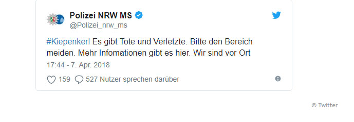 «Τρομερά νέα από το Μύνστερ. Η αστυνομία θα σας ενημερώσει. Οι σκέψεις μας είναι με τα θύματα και τις οικογένειές τους» έγραψε η Ουλρίκε Ντέμμερ.