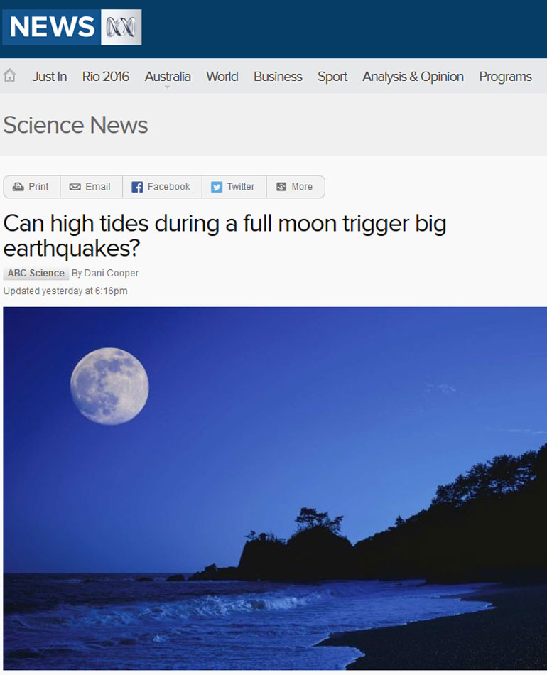 Οι ισχυροί καταστροφικοί σεισμοί, όπως στην Ινδονησία το 2004, στη Χιλή το 2010 και στην Ιαπωνία το 2011, έχουν μεγαλύτερη πιθανότητα να συμβούν όταν υπάρχει πανσέληνος ή νέα σελήνη. Αυτό οφείλεται στο ότι αυτές τις δύο περιόδους του μήνα, όταν ο Ήλιος, η Γη και η Σελήνη ευθυγραμμίζονται, αυξάνεται περισσότερο η βαρυτική επίδραση του φεγγαριού. Αυτό με τη σειρά του, εκτός από τις παλίρροιες, ασκεί μεγαλύτερη πίεση και πάνω στα ρήγματα.