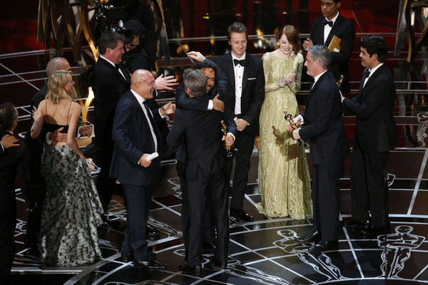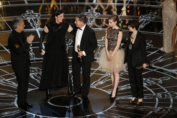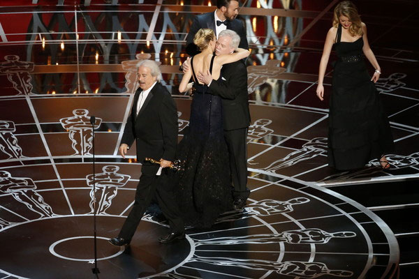 Στη σκηνή ανέβηκαν όλοι οι συντελεστές, οι οποίοι αισθάνονται δικαίως οι μεγάλοι νικητές της 87ης τελετής απονομής των βραβείων Όσκαρ.