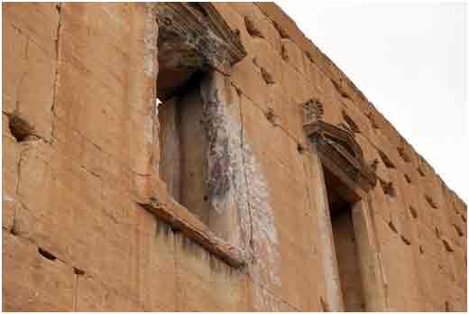 Φωτογραφία του Μαρτίου 2014 που δείχνει οπή από οβίδα σε αρχαίο κτίριο της Παλμύρας