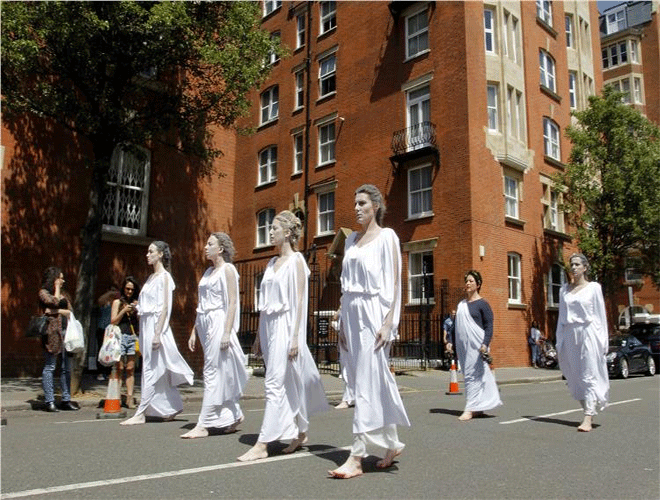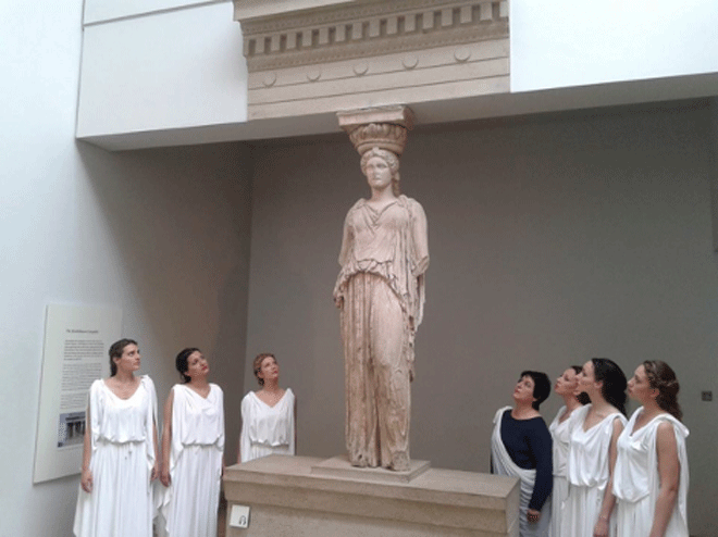 Σε μια διαφορετική και πρωτότυπη διαμαρτυρία προχώρησαν έξι Ελληνίδες ντυμένες ως άλλες Καρυάτιδες και η σοπράνο Σόνια Θεοδωρίδου, καθώς μπήκαν στο βρετανικό μουσείο και «μίλησαν» με τον δικό τους τρόπο για την επιστροφή των γλυπτών του Παρθενώνα.