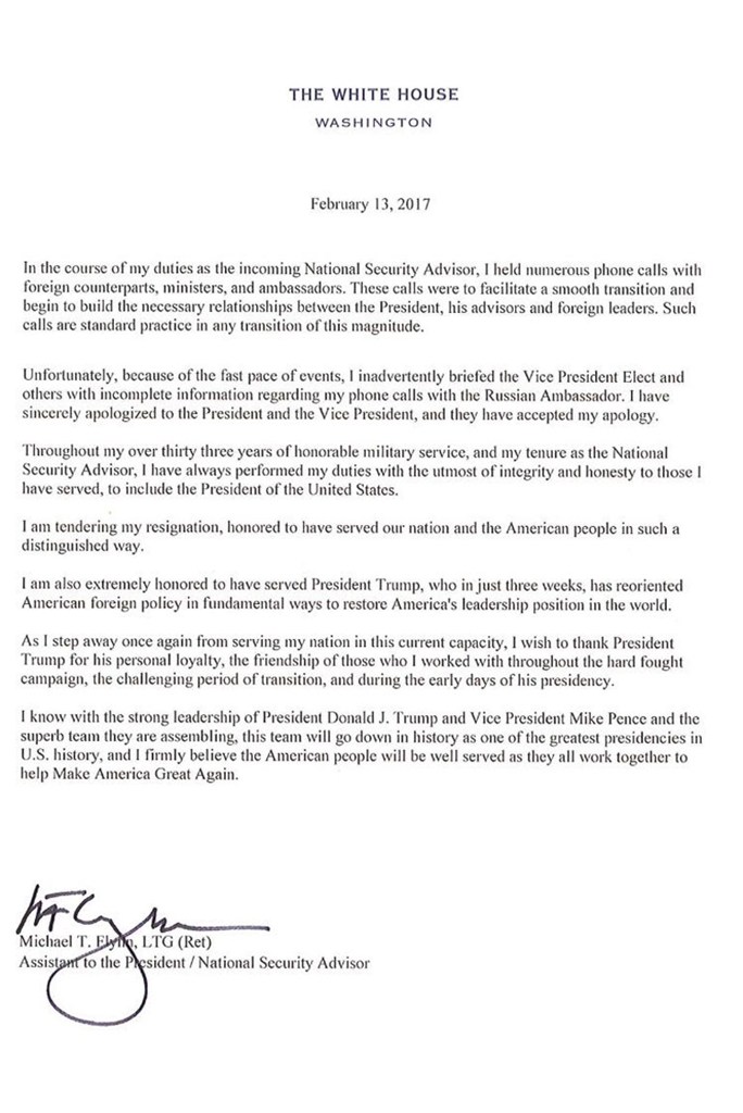 Στην επιστολή της παραίτησής του, ο Μάικλ Φλιν αναφέρει ότι, υπό την ταχύτητα εξέλιξης των γεγονότων, ενημέρωσε χωρίς όμως να έχει πρόθεση, με μη ολοκληρωμένη πληροφόρηση, τον αντιπρόεδρο Μάικ Πενς για τις επαφές που είχε με τη Ρωσία.