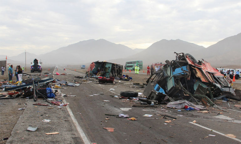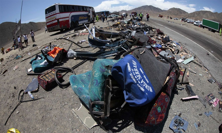 Όπως μετέδωσε το αμερικανικό τηλεοπτικό δίκτυο CNN, τρία λεωφορεία και ένα φορτηγό – ψυγείο συγκρούστηκαν μεταξύ τους τις πρώτες πρωινές ώρες της Δευτέρας σε αυτοκινητόδρομο στα περίχωρα της πόλης Κάσμα (370 χλμ. βόρεια της πρωτεύουσας, Λίμα). Το υπουργείο Υγείας επισημαίνει σε ανακοίνωσή του πως περισσότεροι από 85 άνθρωποι τραυματίστηκαν, εκ των οποίων οι έξι νοσηλεύονται σε κρίσιμη κατάσταση.