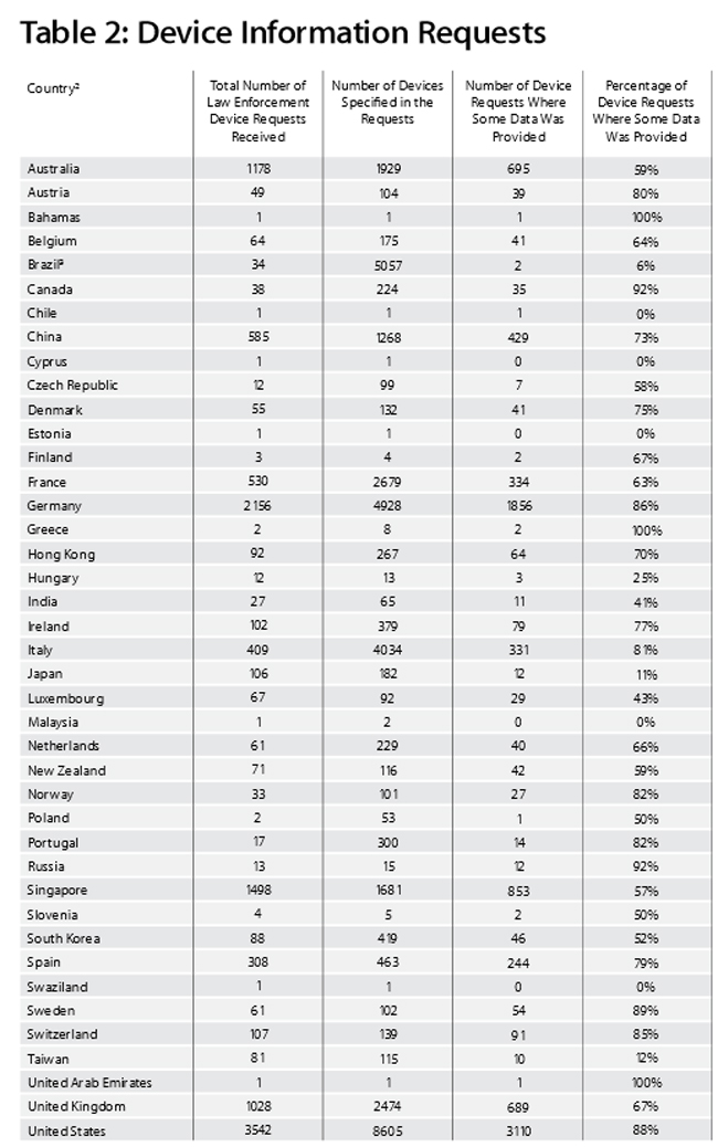 Η πλειονότητα των αιτημάτων αφορούσε, σύμφωνα με ανακοίνωση της εταιρείας, σε κλεμμένα «έξυπνα» κινητά τηλέφωνα και υπολογιστές – ταμπλέτες, την τύχη των οποίων προσπαθούσαν να ανακαλύψουν οι αρχές. Οι πληροφορίες που ζητούσαν οι χώρες αυτές αφορούν το όνομα ή τη διεύθυνσή πελατών και σχετίζονται με αναζήτηση αγνοούμενων ατόμων ή κλοπές. Οι αιτήσεις έγιναν από τις μυστικές υπηρεσίες των χωρών ανά τον κόσμο, οι οποίες επικαλούνταν, μεταξύ άλλων, λόγους «εθνικής ασφάλειας».