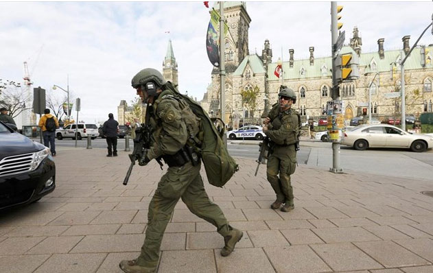 Σοκ έχει προκαλέσει το πρωτοφανές -για τα δεδομένα της χώρας- μπαράζ επιθέσεων που σημειώθηκε το πρωί της Τετάρτης σε κεντρικά σημεία της πρωτεύουσας του Καναδά. Ένοπλοι δράστες εξαπέλυσαν πυρ στο εσωτερικό και τα περίχωρα του κτηρίου του Κοινοβουλίου καθώς και στην περιοχή του Μνημείου των Πεσόντων.