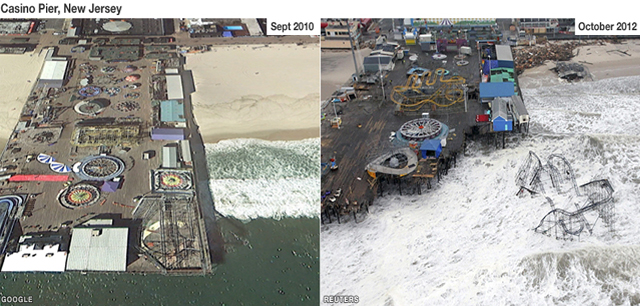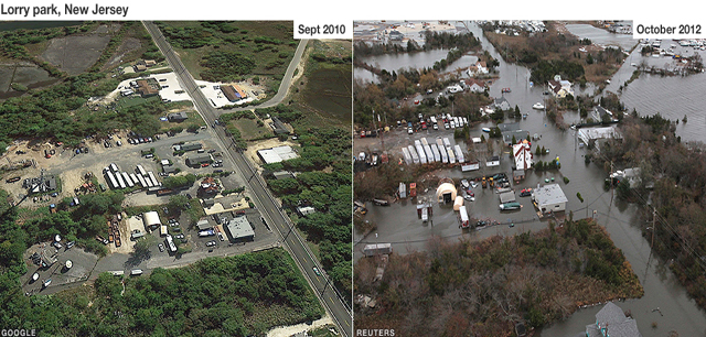 Σπίτια και δρόμοι παραμένουν κάτω από το νερό σε αρκετές παραθαλάσσιες περιοχές του Νιου Τζέρσεϊ, με τις εργασίες αποκατάστασης των ζημιών να βρίσκονται σε πλήρη εξέλιξη. Η συγκεκριμένη πολιτεία θεωρείται ένας από τους δημοφιλέστερους τουριστικούς προορισμούς λόγω των καζίνο που υπάρχουν στο Ατλάντικ Σίτι καθώς και περιοχή με υπερπολυτελείς κατοικίες.