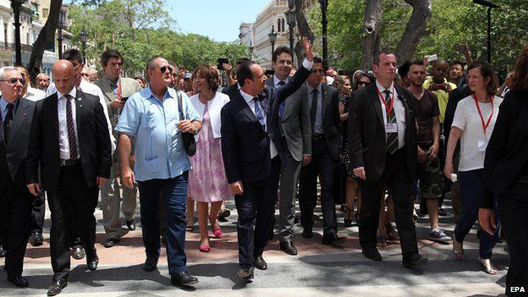 Πρώτος αρχηγός δυτικού κράτους που επισκέπτεται την Κούβα μετά την έναρξη της διαδικασίας προσέγγισης, ο Ολάντ εξέφρασε την αλληλεγγύη του στις κουβανικές αρχές και υπογράμμισε τους δεσμούς που ενώνουν το Παρίσι και την Αβάνα.