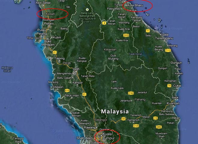 Στον χάρτη εμφανίζονται σε κόκκινο κύκλο τρεις περιοχές-κλειδιά από όπου φέρεται να πέρασε το αεροσκάφος. Ξεκίνησε από την Kuala Lumpur, πέρασε από τις ακτές της Kota Bharu στα ανατολικά και στη συνέχεια σύμφωνα με τις νέες πληροφορίες κατευθύνθηκε στα Στενά της Μάλακα μέσω της περιοχής Kedah.