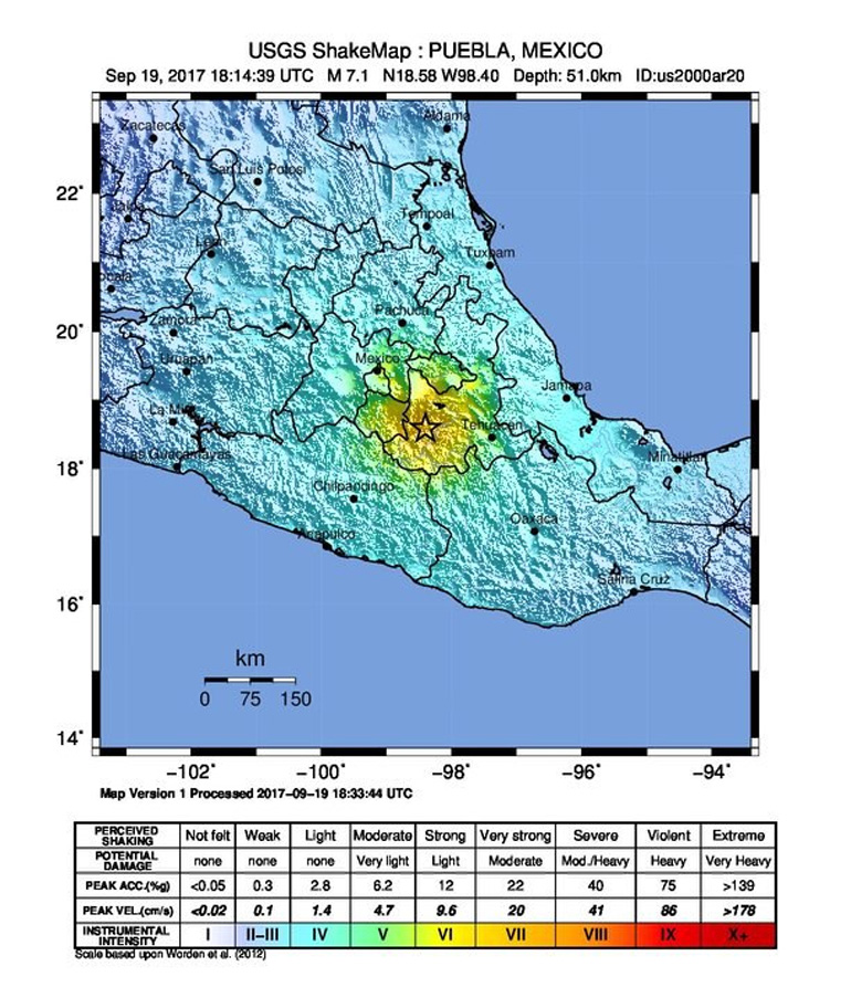 Το επίκεντρο του σεισμού εντοπίστηκε στην Πουέμπλα, κοντά στην πρωτεύουσα, ενώ η δόνηση σημειώθηκε σε εστιακό βάθος 51 χιλιομέτρων. Ο σεισμός προκάλεσε σκηνές πανικού στην πρωτεύουσα, μια μεγαλούπολη 20 εκατομμυρίων, 32 χρόνια ακριβώς μετά τον καταστροφικό σεισμό του 1985, ο οποίος είχε στοιχίσει τη ζωή σε τουλάχιστον 10.000 ανθρώπους στην Πόλη του Μεξικού, κατά τις αρχές. Σύμφωνα με το Αμερικανικό Γεωλογικό Ινστιτούτο είναι πιθανόν τα θύματα από τον ισχυρότατο σεισμό να φτάσουν τα 1.000.