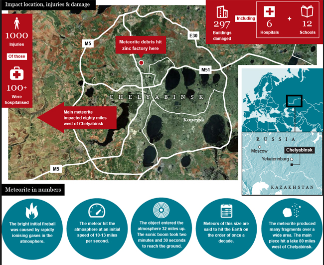 Συνολικά περί τα 1.000 άτομα τραυματίστηκαν, 762 κτήρια υπέστησαν ζημιές, εκ των οποίων 12 σχολεία και 6 νοσοκομεία από το «χτύπημα» μετεωριτών στα Ουράλια Όρη στην Κεντρική Ρωσία.