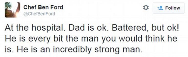 «Βρίσκεται στο νοσοκομείο. Ο μπαμπάς είναι εντάξει. Τραυματισμένος αλλά εντάξει» έγραψε στον λογαριασμό του στο Twitter ο γιος του Φορντ, Μπεν. «Είναι ο θαρραλέος άνδρας που ξέρετε όλοι. Είναι ένας απίστευτα δυνατός άνθρωπος» πρόσθεσε.