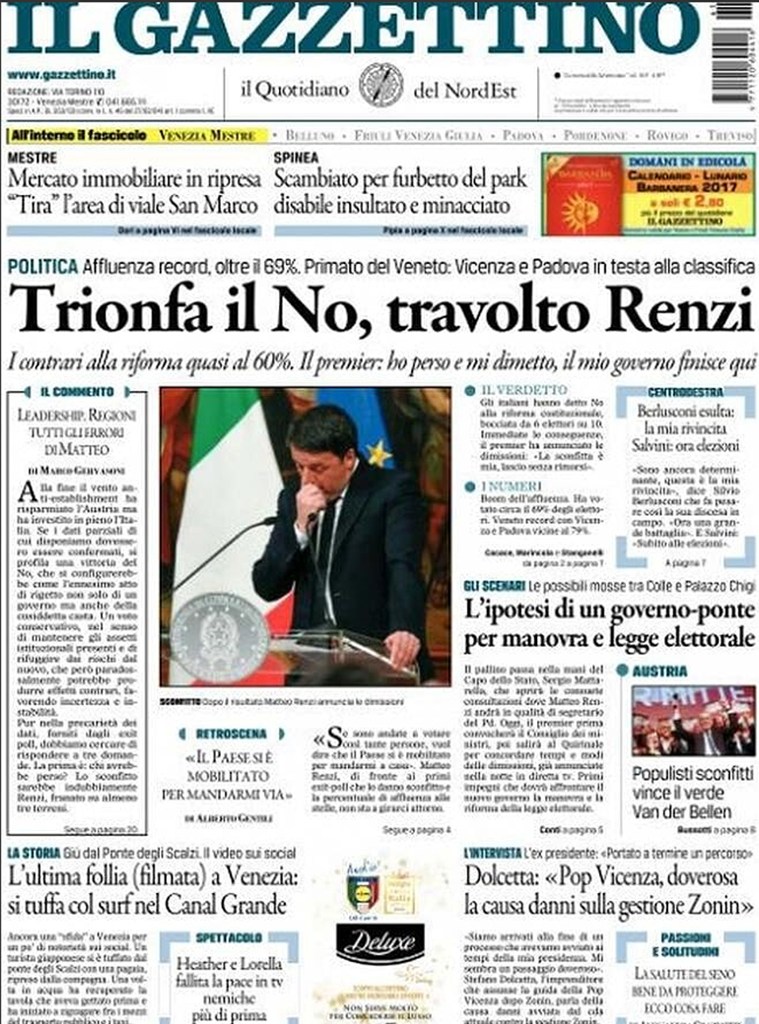 IL GAZZETTINΟ: «Θριαμβεύει το ΟΧΙ, συγκλονισμένος ο Ρέντσι»