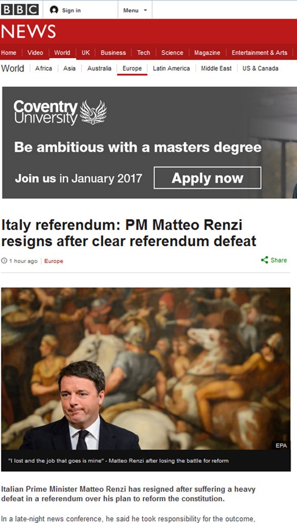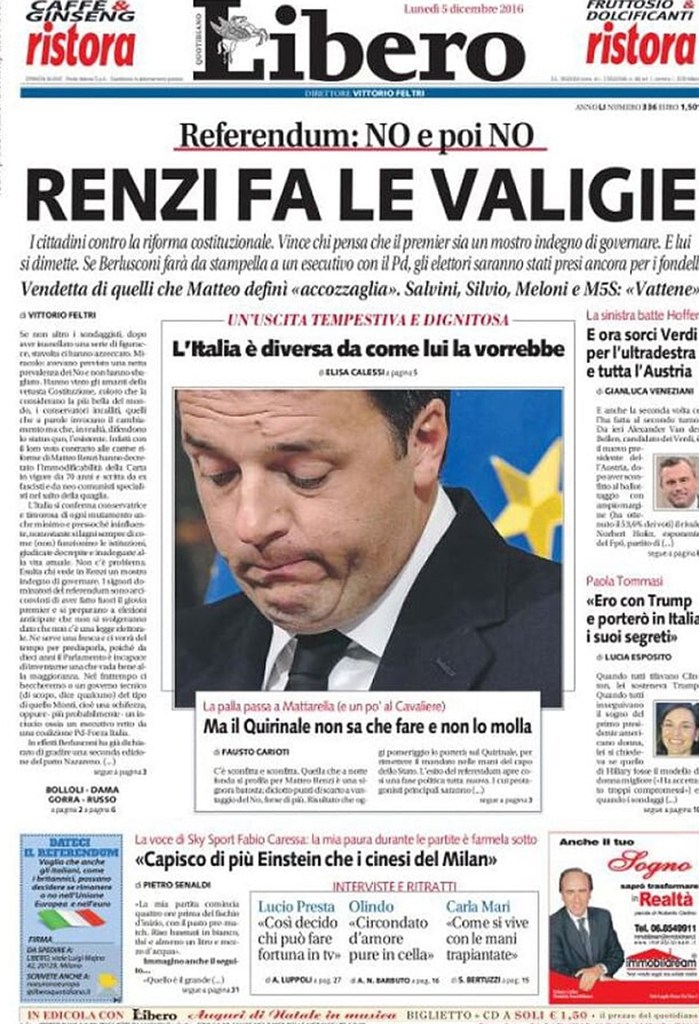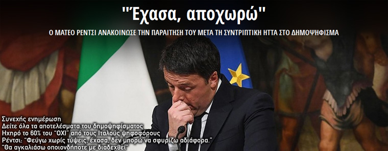 ΒΒC: Ιταλικό δημοψήφισμα – Ο πρωθυπουργός Ματέο Ρέντσι παραιτείται έπειτα από καθαρή ήττα στο δημοψήφισμα. Σύμφωνα με το BBC, χθες «πολλοί Ευρωπαίοι ηγέτες δεν κοιμήθηκαν. Η αγωνία για την Ιταλία αποτέλεσε ένα όχι και τόσο ”μαλακό μαξιλάρι” για τους ίδιους και πολλοί ανησυχούν. Ιδιαίτερα στις Βρυξέλλες. Αυτό διότι ο Ρέντσι ήταν ο μοναδικός αριστερός στην Ευρώπη που είχε ένα όραμα για το μέλλον της Ευρώπης».