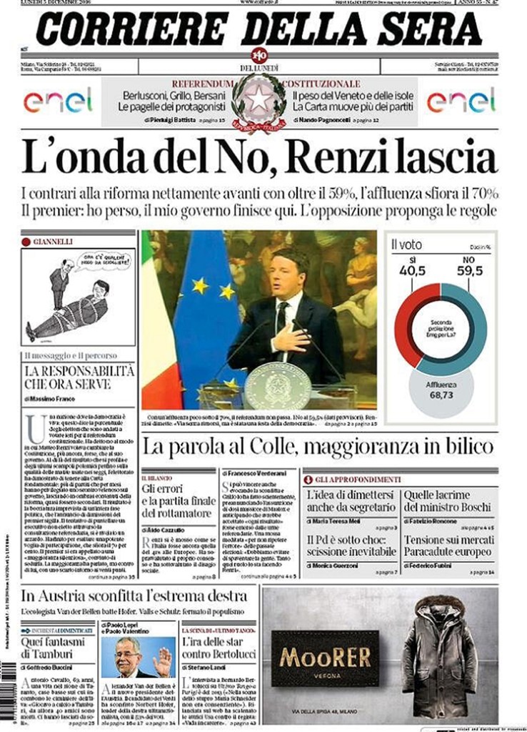 Corriere della Sera: «Το κύμα του ΟΧΙ, ο Ρέντσι φεύγει»