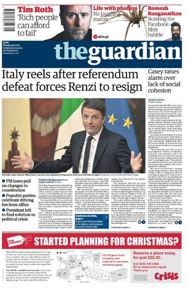 Guardian: Η Ιταλία παραπαίει, καθώς η ήττα στο δημοψήφισμα οδήγησε σε παραίτηση του Ρέντσι. Σύμφωνα με τον βρετανικό «Guardian» ο Ιταλός πρόεδρος δεν αναμένεται να οδηγήσει τη χώρα σε νέες εκλογές, αλλά να τοποθετήσει έναν υπηρεσιακό πρωθυπουργό. Οι Πιερ Κάρλο Πάντοαν (υπ. Οικονομικών), Ντάριο Φραντσεσκίνι (υπ. Πολιτισμού) και Πιέτρο Γκράσσο (πρόεδρος της Γερουσίας) είναι τα επικρατέστερα ονόματα.