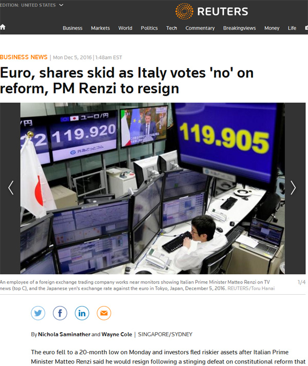 Reuters: Ευρώ και μετοχές ολισθαίνουν έπειτα από το «όχι» στο δημοψήφισμα και την παραίτηση Ρέντσι… Σε χαμηλό 20 μηνών διολίσθησε το ευρώ τη Δευτέρα, με τους επενδυτές να αποφεύγουν πιο ριψοκίνδυνες κινήσεις μετά την ανακοίνωση Ρέντσι ότι θα παραιτηθεί, στον απόηχο της ήττας στο δημοψήφισμα για συνταγματική αναθεώρηση.