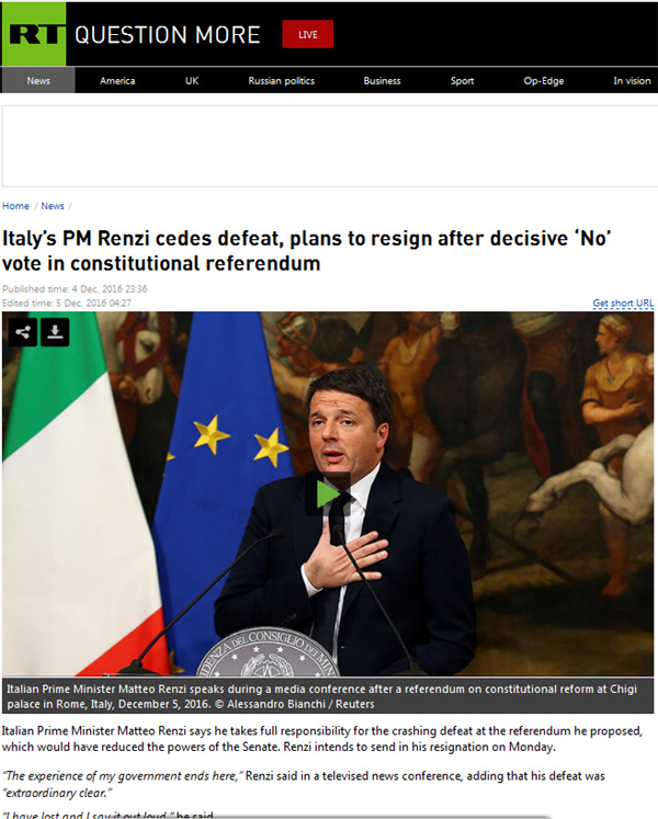 RT: O Ιταλός πρωθυπουργός αναγνώρισε την ήττα του, σχεδιάζει να παραιτηθεί έπειτα από το αποφασιστικό «όχι» στο δημοψήφισμα για συνταγματική αναθεώρηση. Η αναλύτρια του RT Paula Slier που μίλησε με ψηφοφόρους στη Ρώμη σχολίασε τα εξής: Τα media μπορεί να παρουσιάσουν το αποτέλεσμα ως προσωπική ήττα, μία άρνηση να δοθεί στον Ρέντσι ψήφος εμπιστοσύνης… Ωστόσο, είναι κάτι πιο συμβολικό… Θα μπορούσε να είναι μια ψήφος κατά της Ε.Ε. και των πολιτικών που ακολουθούνται στην Ευρώπη…