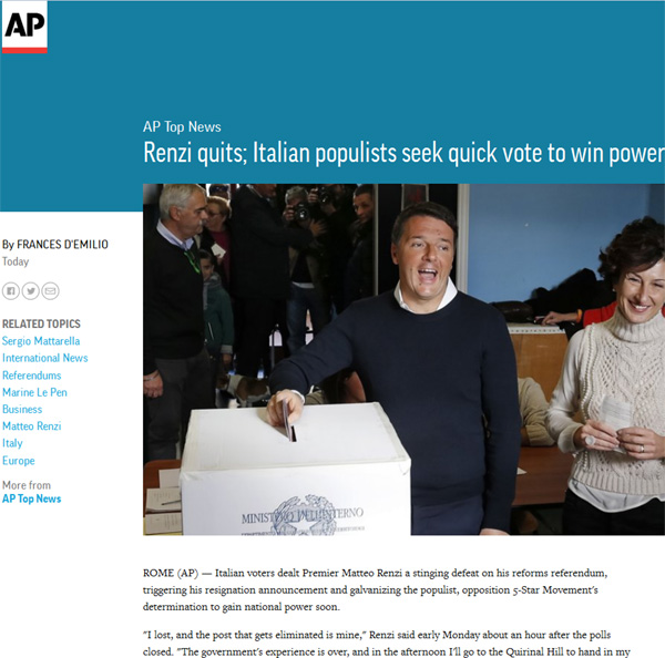 Associated Press: Ο Ρέντσι παραιτείται, οι Ιταλοί λαϊκιστές κυνηγούν γρήγορη προσφυγή στις κάλπες. Σύμφωνα με το AP, «ψηφίζοντας όχι, οι Ιταλοί επέπληξαν τους βιομηχάνους, τους τραπεζίτες και γενικότερα το κατεστημένο, που είχαν σθεναρά υποστηρίξει το δημοψήφισμα. Η νίκη της μη καθεστηκυίας τάξης, η οποία τρομάζει τους επενδυτές, έρχεται ακριβώς τη στιγμή που η κυβέρνηση έκανε κάποια βήματα στη μείωση του μεγάλου ποσοστού ανεργίας των νέων και τη στιγμή που οι ιταλικές τράπεζες έχουν μεγάλη ανάγκη ανακεφαλαιοποίησης».