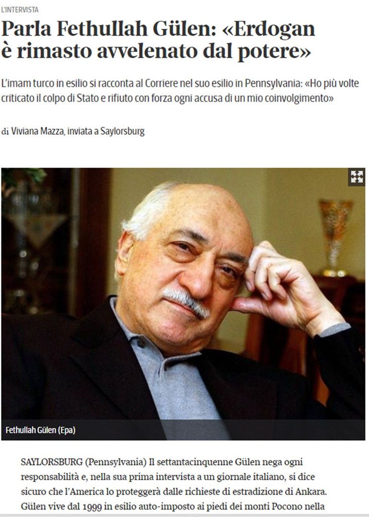 Στην κατάσταση στην Τουρκία, στo αποτυχημένo πραξικόπημα και στη σχέση του με τον πρόεδρο Ερντογάν αναφέρεται ο ιμάμης Φετουλάχ Γκιουλέν, σε συνέντευξη που παραχώρησε στην ιταλική εφημερίδα Corriere della Sera.