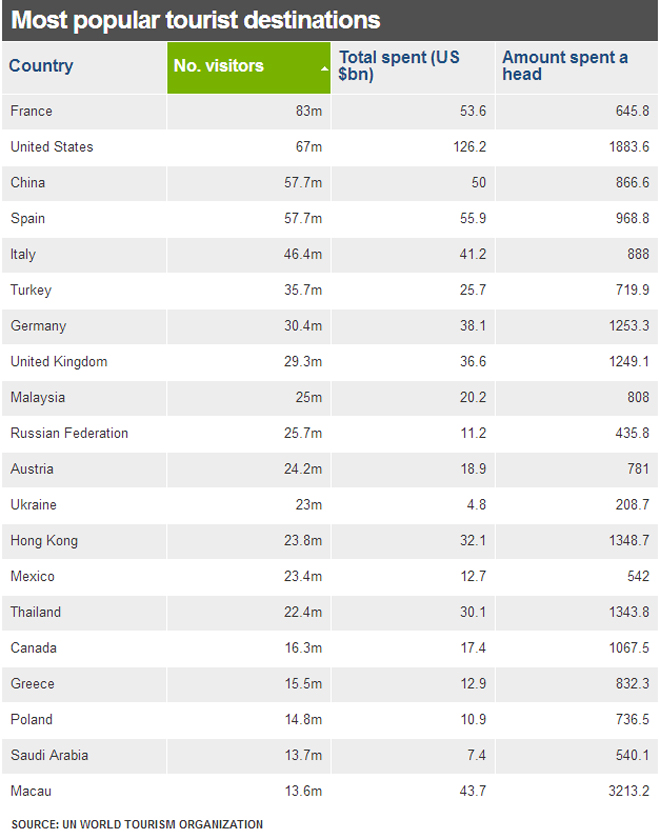 Η έρευνα αποδεικνύει ότι η Γαλλία με 83 εκατομμύρια επισκέπτες το 2012 βρίσκεται στην πρώτη θέση (μεταξύ 193 χωρών) και έπονται με μεγάλη διαφορά οι ΗΠΑ (67 εκατ.), η Κίνα και η Ισπανία (57,7 εκατ.), ενώ στην πέμπτη θέση είναι η Ιταλία με 46,4 εκατ. τουρίστες.