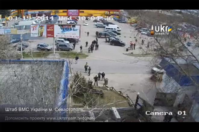 Το Interfax λέει πως πρόκειται για χιλιάδες κόσμου οι οποίοι από το πρωί διαδήλωναν έξω από τη ναυτική βάση της Σεβαστούπολης. Περίπου στις 8 το πρωί τοπική ώρα έκοψαν την περίφραξη και εισέβαλαν μέσα στη βάση αλλάζοντας τις σημαίες.