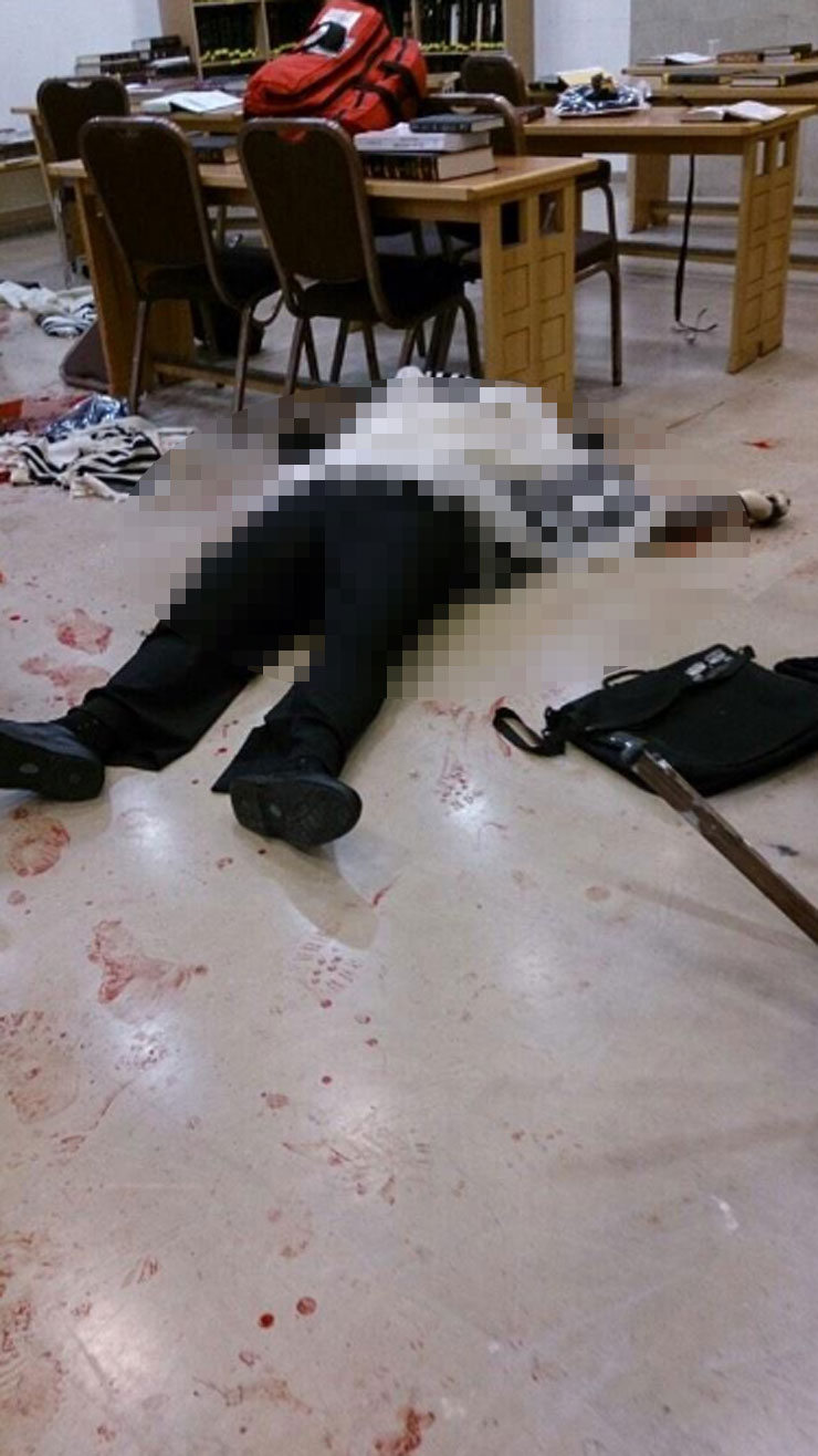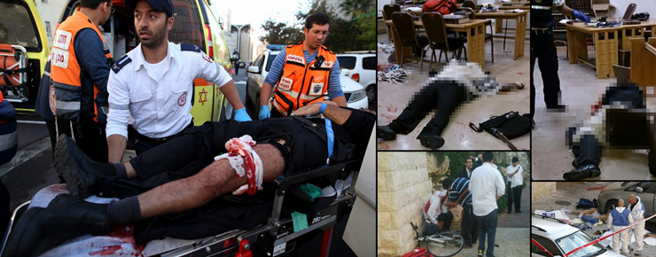 Μακελειό σημειώθηκε το πρωί της Τρίτης σε συναγωγή της Ιερουσαλήμ. Δύο Παλαιστίνιοι εισέβαλαν σε συναγωγή στη συνοικία Χαρ Νοφ με τσεκούρι και μπαλτάδες, και επιτέθηκαν στους παρευρισκόμενους, με αποτέλεσμα να σκοτωθούν τέσσερις Ισραηλινοί.