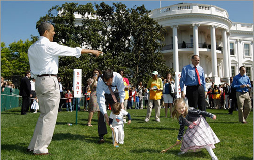 Οι παρευρισκόμενοι είχαν τη δυνατότητα να δουν τον Barack Obama να βοηθάει έναν μπόμπιρα να σπρώξει το αυγό του μέχρι τον τερματισμό…
