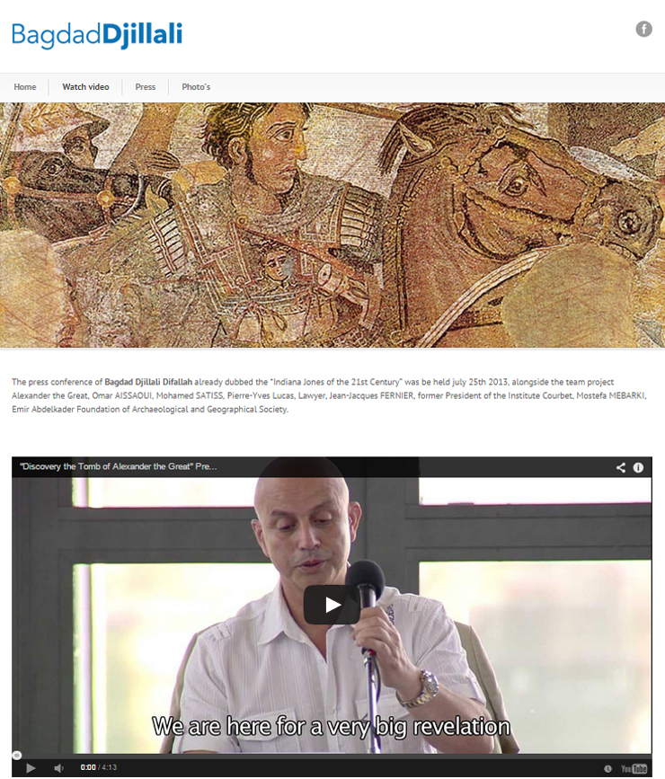 Ο Baghdad Djillali Difallah παραχώρησε την πρώτη του συνέντευξη Τύπου προκειμένου να αποκαλύψει την πρωτοφανή ανακάλυψη.Η συνέντευξη Τύπου του Bagdad Djillali Difallah στον οποίο έχει ήδη αποδοθεί το προσωνύμιο “Ιντιάνα Τζόουνς του 21ου αιώνα” επρόκειτο να πραγματοποιηθεί παράλληλα με το πρότζεκτ της ομάδας “Αλέξανδρος ο Μέγας”, των Omar AISSAOUI, Mohamed SATISS, Pierre-Yves LUCAS -δικηγόρου, Jean-Jacques FERNIER, πρώην προέδρου του Ινστιτούτου “Courbet”, Mostefa MEBARKI, Emir Abdelkader του Ιδρύματος της Αρχαιολογικής και Γεωγραφικής Κοινότητας.