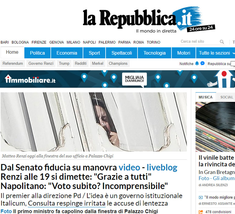 Παραιτήθηκε επίσημα το βράδυ της Τετάρτης ο πρωθυπουργός της Ιταλίας Ματέο Ρέντσι. Την ίδια ημέρα η ιταλική Γερουσία ενέκρινε τον κρατικό προϋπολογισμό του 2017.