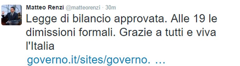 «Ο προϋπολογισμός ψηφίστηκε. Στις 19.00 (τοπική ώρα) η επίσημη παραίτηση. Σας ευχαριστώ όλους και ζήτω η Ιταλία», ήταν η ανάρτηση του Ιταλού πρωθυπουργού, στον προσωπικό του λογαριασμό στο Twitter την Τετάρτη το απόγευμα.