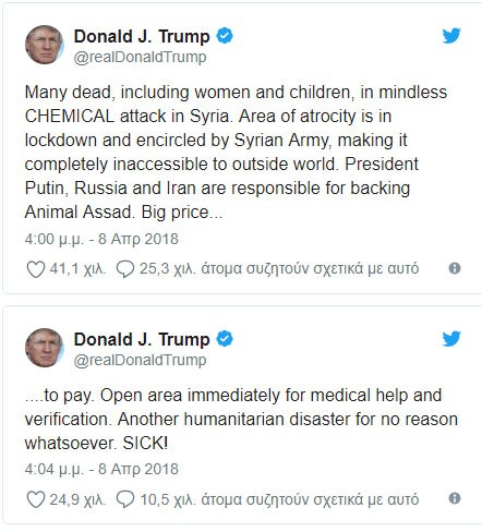 Στην ανάρτησή του στο Twitter με την οποία ο Τραμπ έκανε την προειδοποίηση αυτή, χαρακτήρισε «ζώο» τον πρόεδρο της Συρίας Μπασάρ αλ Άσαντ κι έκανε λόγο περί «ευθυνών» της Ρωσίας και του Ιράν.
