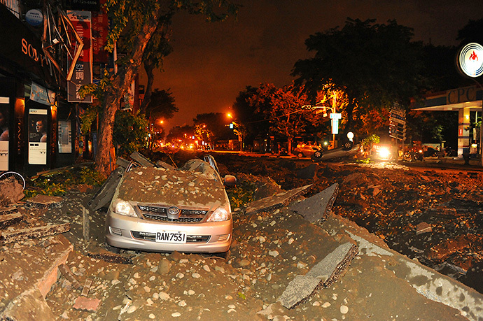 Οι ζημιές σε δρόμους, σπίτια και αυτοκίνητα είναι τεράστιες και πολλοί πολίτες μεταφέρονται σε σχολεία της πόλης για να βρουν καταφύγιο.