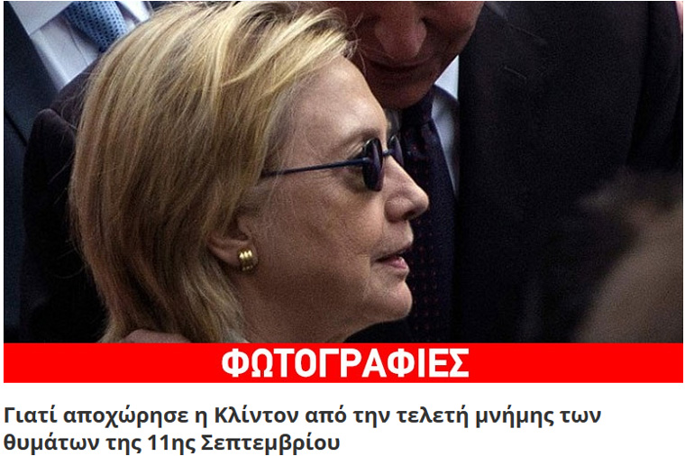 Τα πλάνα που δείχνουν την κα Κλίντον να εγκαταλείπει την εκδήλωση για τα θύματα της 11ης Σεπτεμβρίου υποβασταζόμενη από συνεργάτες της και να καταρρέει λίγο πριν επιβιβαστεί στο όχημα που την περίμενε αποτελούν το χειρότερο δυνατό σενάριο για την υποψήφια των Δημοκρατικών στην καυτή φάση του αμερικανικού προεκλογικού αγώνα.