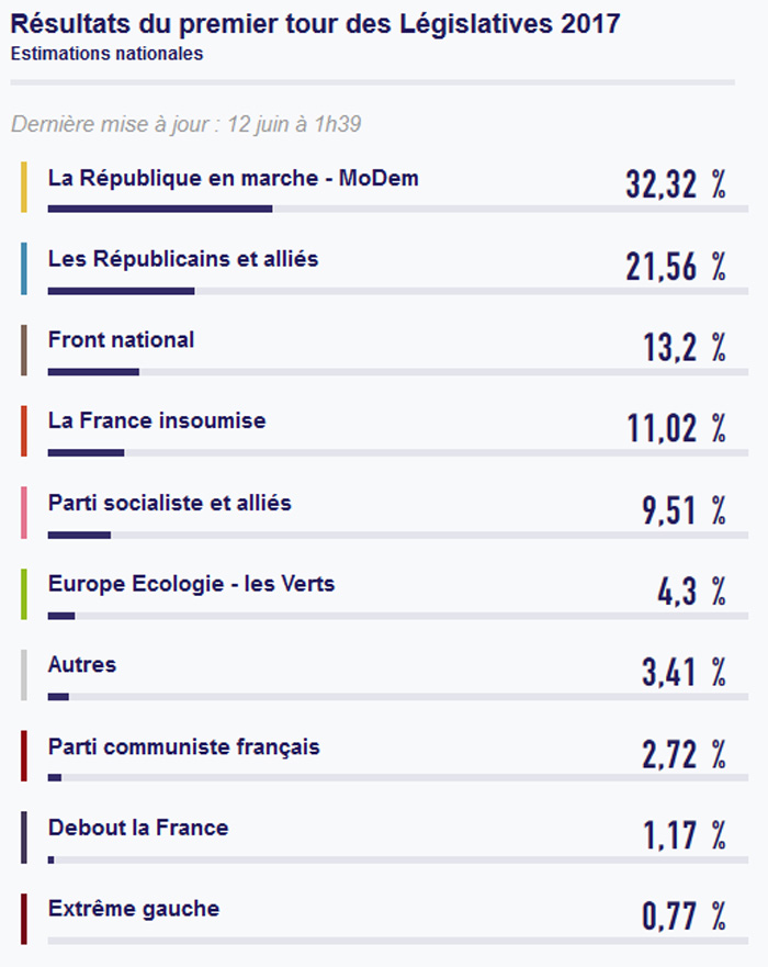 Το προεδρικό κόμμα Republique en Marche και το σύμμαχό του MODEM κατέλαβαν με διαφορά την πρώτη θέση στον πρώτο γύρο των βουλευτικών εκλογών με 32,32% των ψήφων.