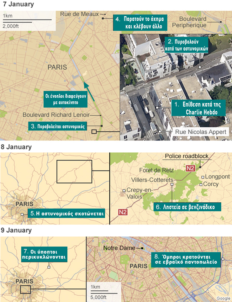 Σε ένα κυνήγι απόδοσης ευθυνών και εντοπισμού συνεργών για τον τριήμερο εφιάλτη στη Γαλλία, o οποίoς ξεκίνησε την περασμένη Τετάρτη με την αιματηρή επίθεση στο σατιρικό περιοδικό «Charlie Hebdo», επιδίδονται από χθες οι αρχές.