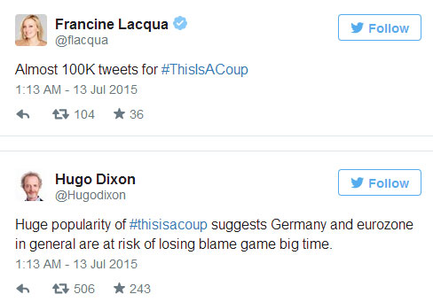 Τα περισσότερα από τα 100 χιλιάδες και πλέον «τιτιβίσματα» καταφέρονται κατά της γερμανικής πολιτικής και εκφράζουν την αλληλεγγύη τους στην Ελλάδα.